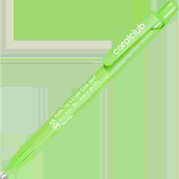 Golyóstoll nyomógombos mechanizmussal, PET-RECYCLED anyagból, "Szia, én a Coral Club tolla vagyok! Előző életemben műanyag palack voltam" felirattal.